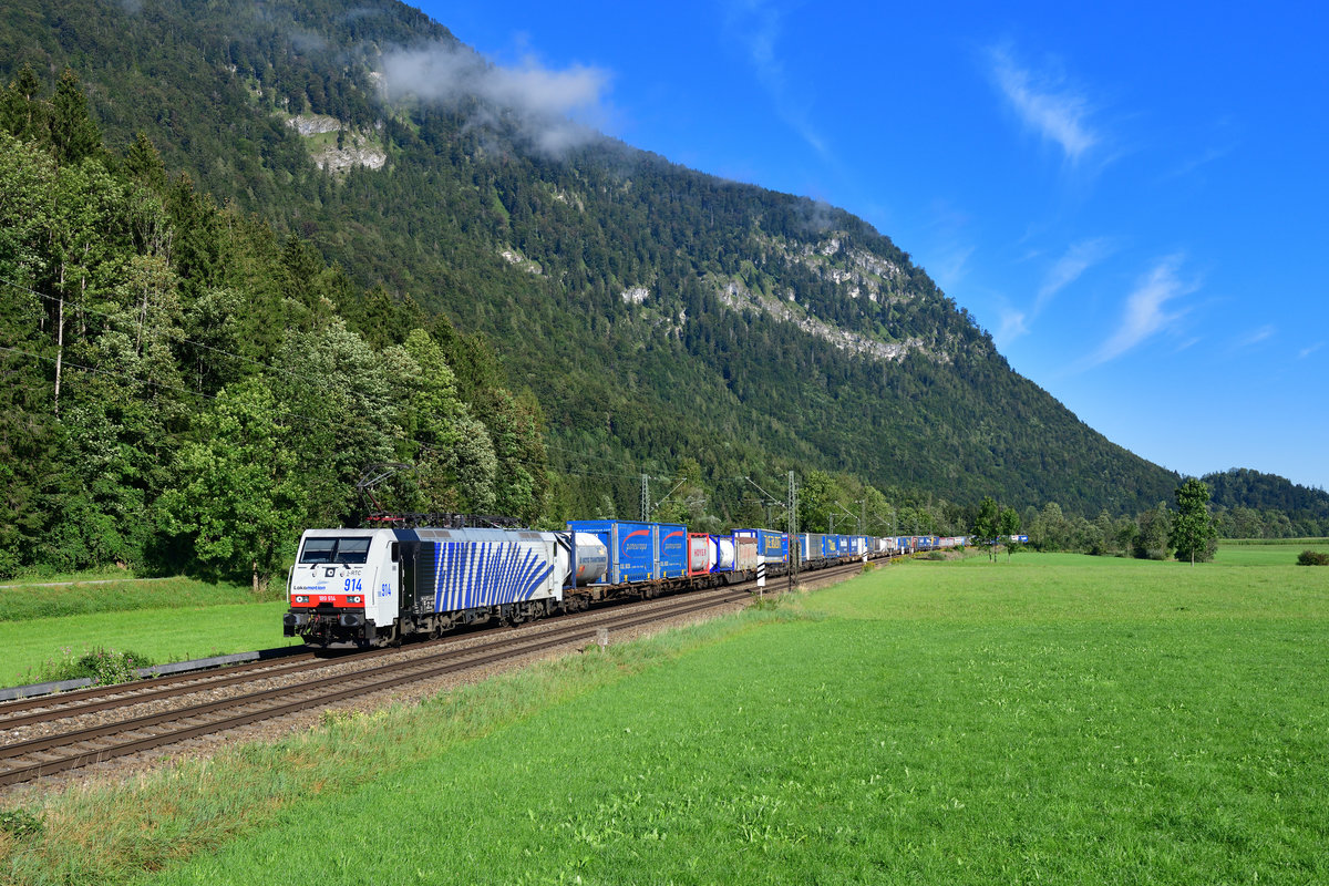 193 774 und 189 902 mit Schiebewandwagen aus Salzburg kommend am 1. Juli 2020 bei Grabenstätt im Chiemgau.