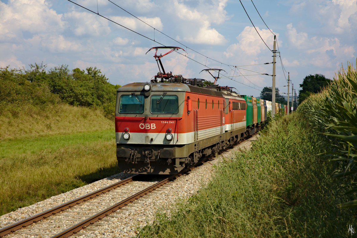 Nachdem die Nordwestbahn wegen Streckensanierungsarbeiten zur Zeit zwischen Sirndorf und Zellerndorf gesperrt ist, werden die Güterzüge über Laa an der Thaya und der Pulkautalbahn umgeleitet. Einer Dieser Züge mit der 1144.041 und einer 1142 bei Kottingneusiedl. (10.08.2020)