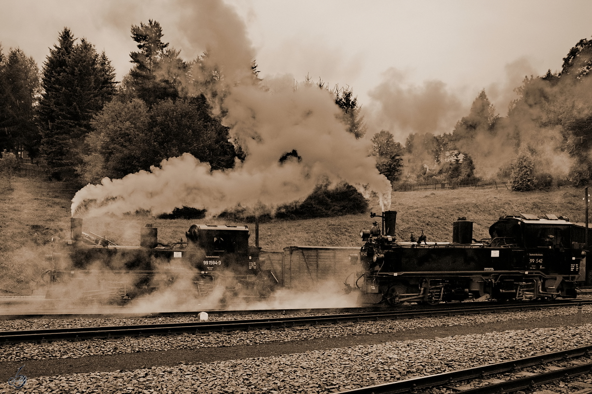 Die Dampflokomotiven 99 1594-3 und 99 542 kurz nach der Ankunft am Bahnhof in Schmalzgrube. (September 2020)