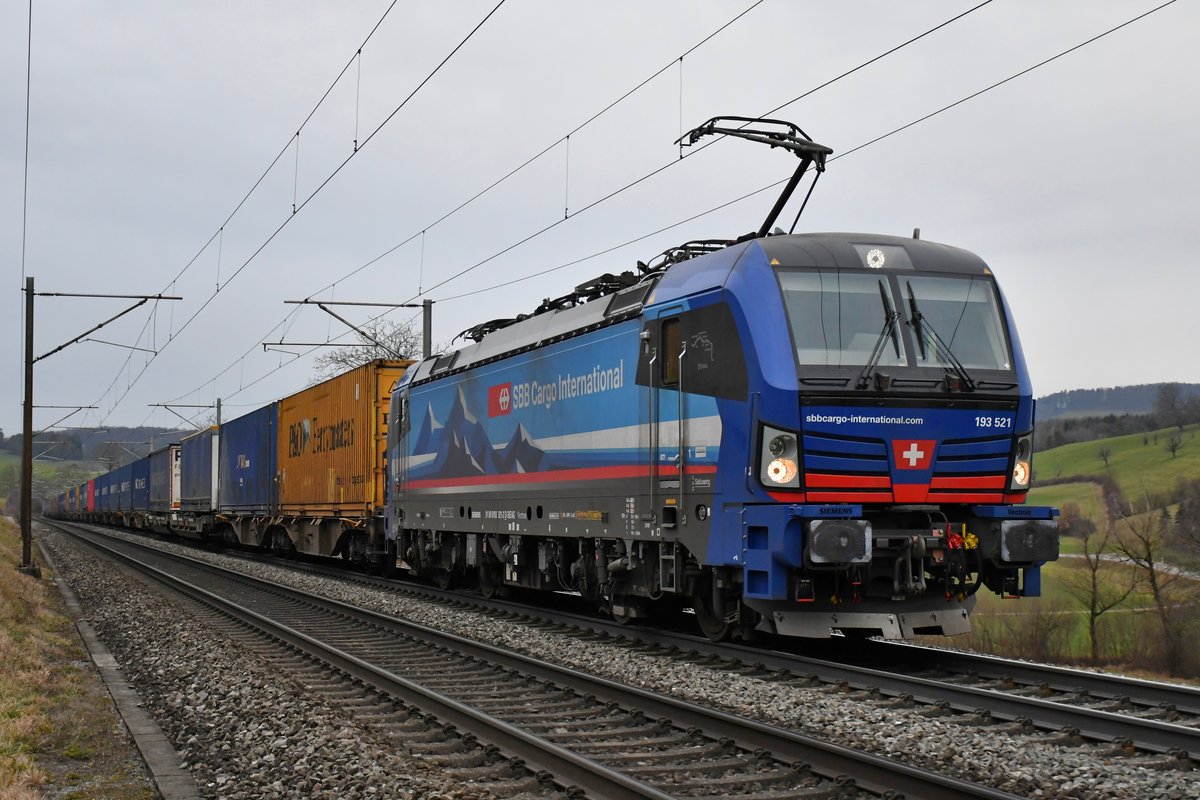 Am Nachmittag des 23.04.2020 fuhr LokRoll/SBBCI 193 461 "Olten" nördlich von Hügelheim mit einem langen KLV über die Rheintalbahn durchs Markgräflerland in Richtung Freiburg (Breisgau).