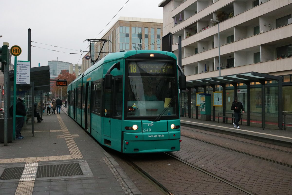 VGF Bombardier Flexity Classic S-Wagen 274 am 21.12.20 in Frankfurt am Main mit einen Minion als Beifahrer