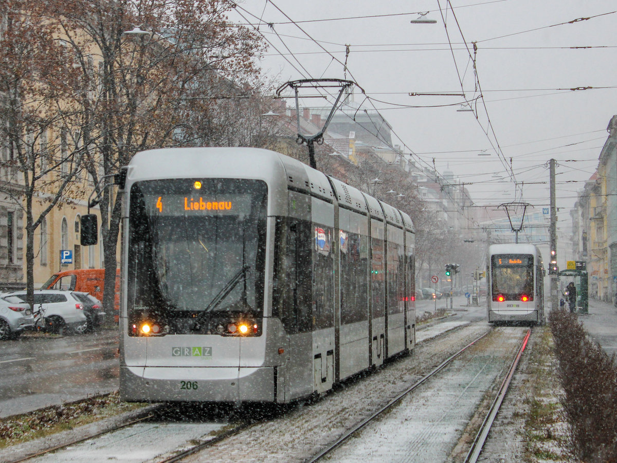Graz. Am Nachmittag des 02.12.2020 gab es in Graz ein leichtes Schneetreiben, ehe in der Nacht auf den nächsten Tag 10 Zentimeter Neuschnee fallen. Variobahn 206 konnte ich als Linie 4 bei der Haltestelle Jakominigürtel/tim ablichten.