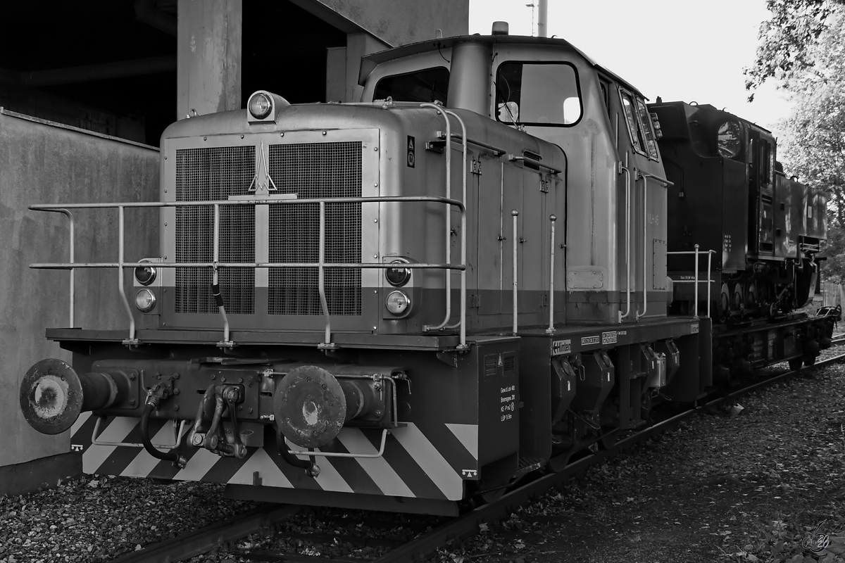 Die Rangierlokomotive WLH45 "Silberpfeil" wartet mit einer Schmalspurdampflokomotive der Rügensche Bäderbahn (vermutlich 99 1781) am Tor der Westfälischen Lokomotiv-Fabrik Reuschling. (Hattingen, September 2020).