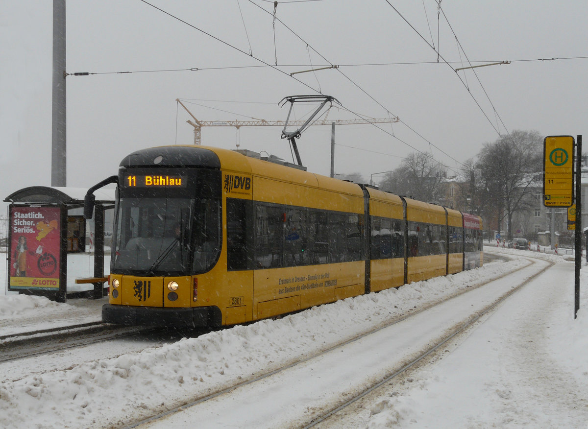 17. Dezember 2010, Dresden: Auf der Bautzener Straße an der Haltestelle  Waldschlösschen  fährt Tw 2801 (Typ NGT 12 DD) als ein Zug der Linie 11 nach Bühlau.