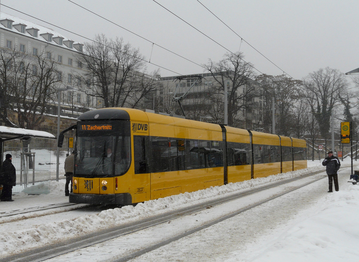 17. Dezember 2010, Dresden: Auf der Bautzener Straße in Höhe des "Waldschlösschens" fährt Tw 2837 (Typ NGT 12 DD) als ein Zug der Linie 11 nach Zschertnitz.