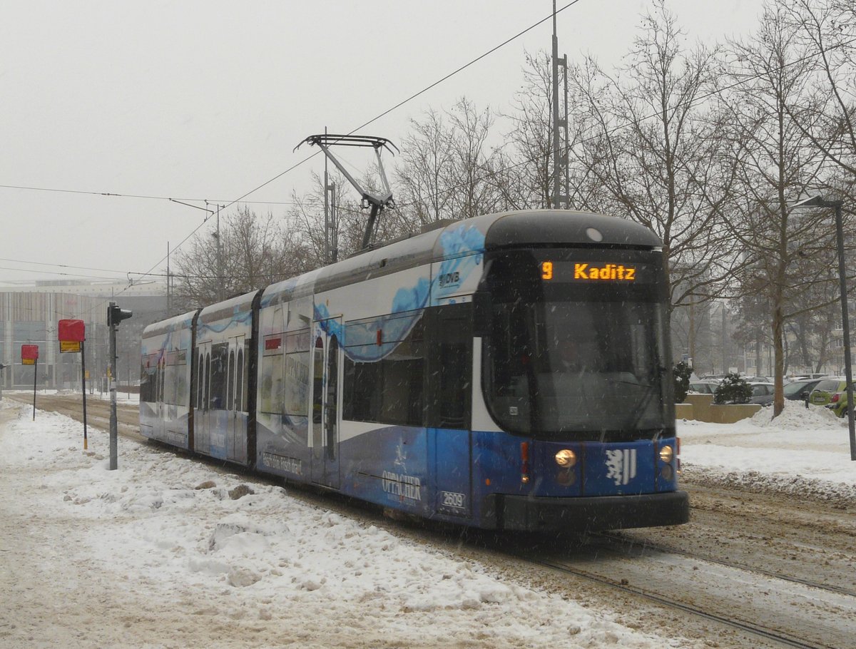 17. Dezember 2010, Dresden: In der Wallstraße fährt Tw 2609 als ein Zug der Linie 9 nach Kaditz.
