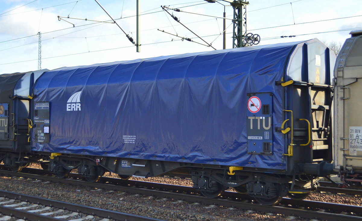 Österreichischer Drehgestell-Flachwagen mit Schiebeplane für Coil-Transporte vom Einsteller ERR für Fa. Rail Cargo Wagon - Austria GmbH mit der Nr. 31 RIV 81 A-RCW 477 7 021-4 Shimmns5 Heimatbf. Linz Voest Alpine in einem gemischten Güterzug am 28.01.20 Bf. Flughafen Berlin Schönefeld.