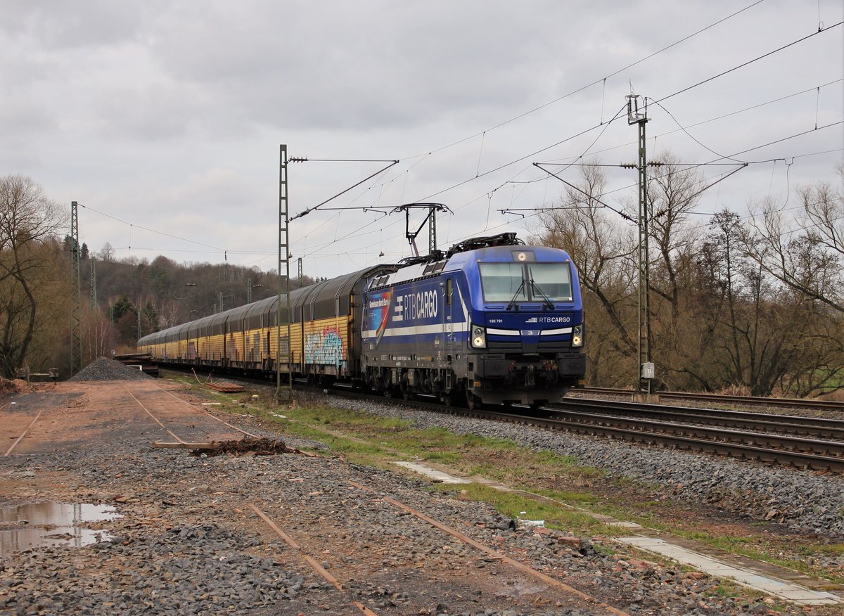 Raildox GmbH & Co. KG, Erfurt [D] "187 319-9" [NVR-Nummer: 91 80 6187 319-9 D-RDX] und einem Ganzzug Schüttgutwagen mit Schwenkdach am 19.02.20 Durchfahrt Bhf. Golm (Potsdam).