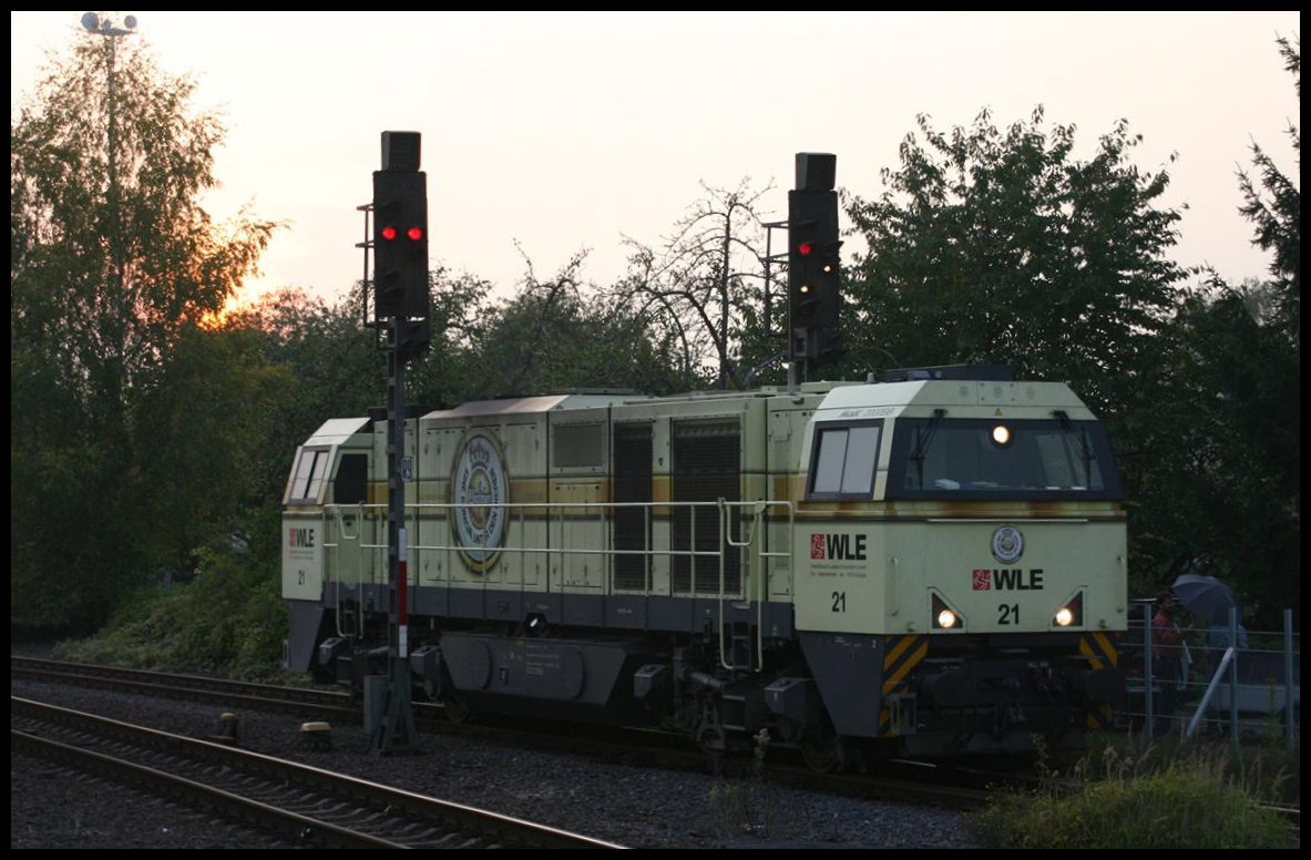 WLE 21, die Warsteiner Bier Lok, steht hier am 11.10.2007 um 18.25 Uhr mit einem kurzen Güterzug zur Abfahrt in Neubeckum bereit.