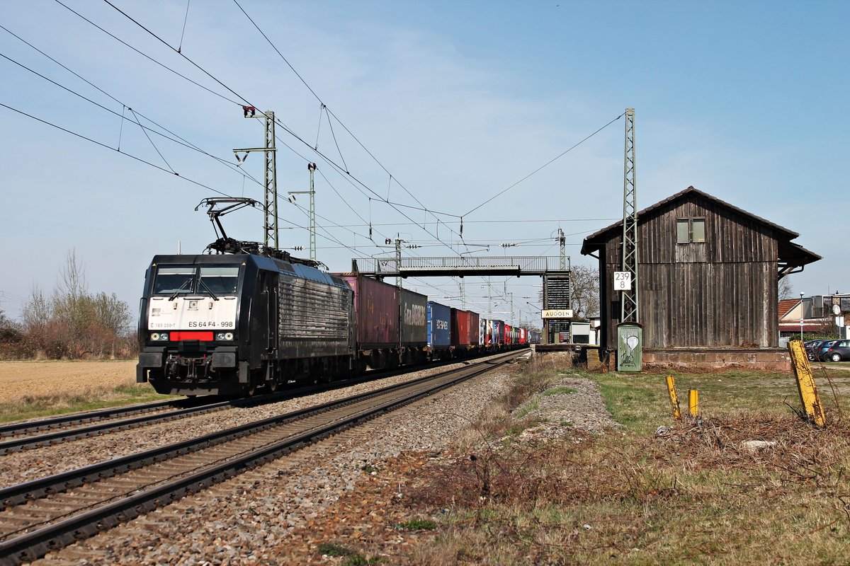 Mit einem Containerzug aus Rotterdam fuhr am Mittag des 20.03.2019 die MRCE/SBBCI ES 64 F4-998 (189 098-7) durch den Haltepunkt von Auggen im Markgräflerland in Richtung Schweizer Grenze.