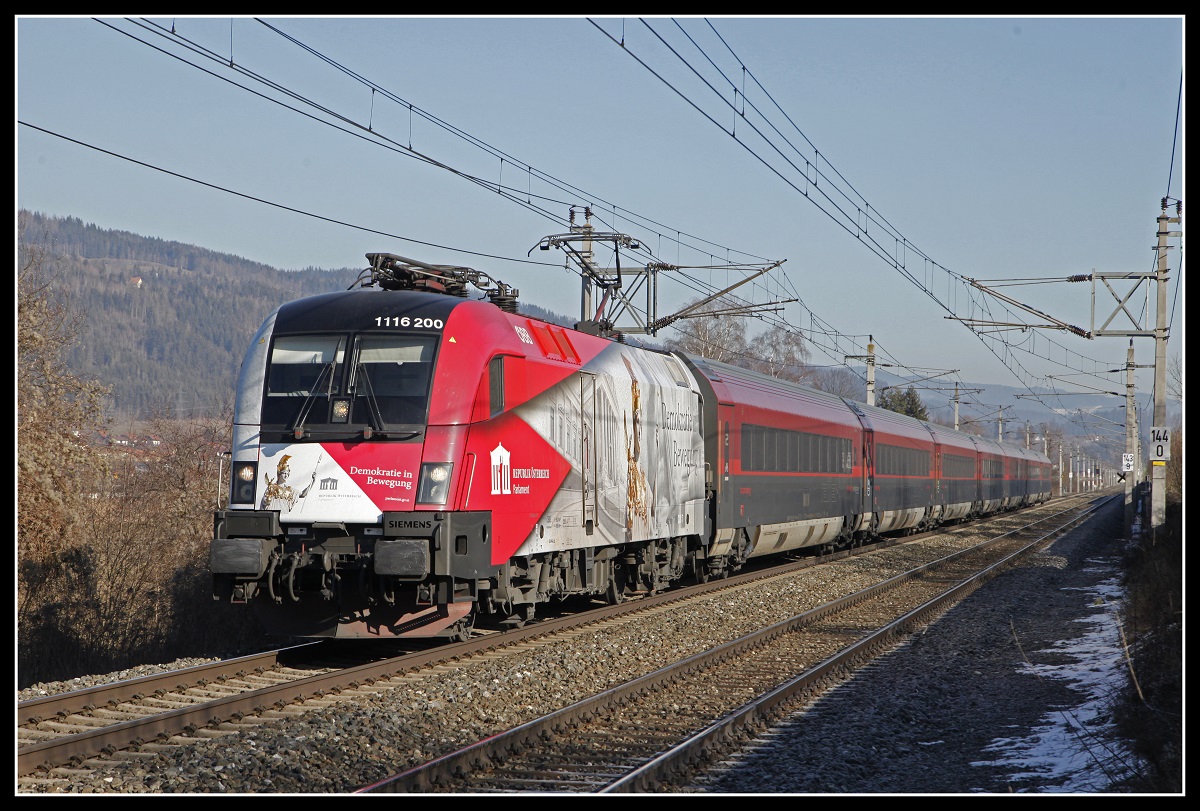 1144 110 + 1116 120 mit Güterzug bei Allerheiligen - Mürzhofen am 23.01.2020.