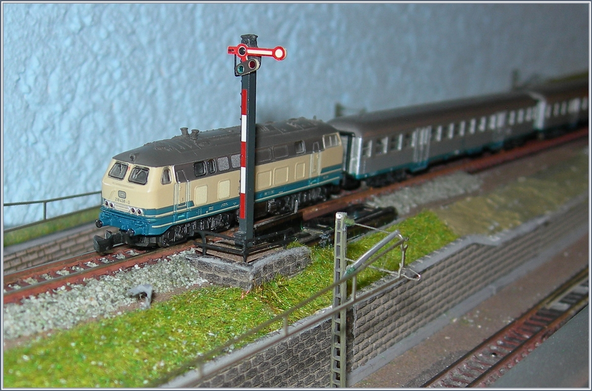 In meinen alten Beständen fanden sich noch einige Märklin mini club Flügelsignale (8940), davon waren zwei noch funktionsfähig, so dass ich sie in meine Anlage integrierte, was gar nicht so einfach war, nicht etwa kompliziert gewesen wäre, die farbigen Drähte entsprechend anzuschliessen, doch bei der Gestaltung und Planung der Anlage vor zehn Jahren hatte ich beschlossen, keine Schaltgeleise im sichtbaren Bereich einzubauen. Folglich musste für die im automatischen Pendelbetreibe bediente Strecke ein Schaltgeleis VOR dem Signal dieses nicht nur auf Fahrt stellen, sondern mit dem gleichen Schaltbefehl (verzögert) wieder schliessen, dazu musste ich die verschieden Stromsorten (5 V DC, 10 V AC, 16 V DC/AC entsprechend meinen Bedürfnissen gerecht zu nutzen. Vor einigen Jahren bereits versucht, mit einem Zeitimpulsverzögerer das Problem zu lösen, explodierte damals ein Kondensator, so dass ich dieses Mal etwas vorsichtiger und behutsam (Tests/Fachliteratur) zu Werke ging.