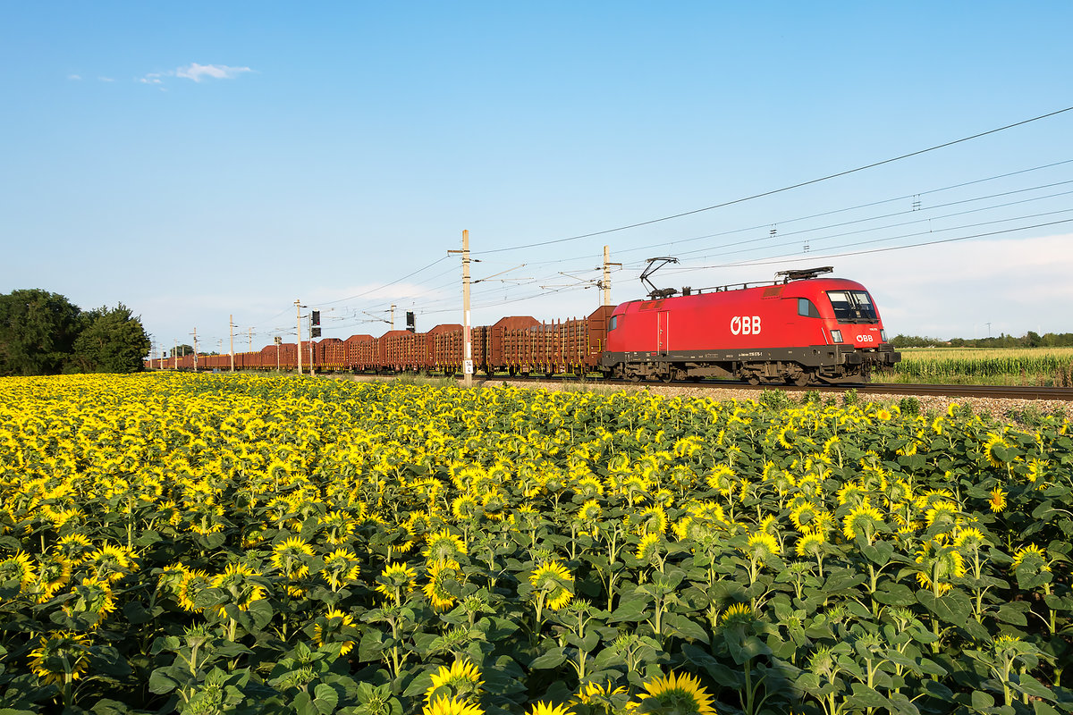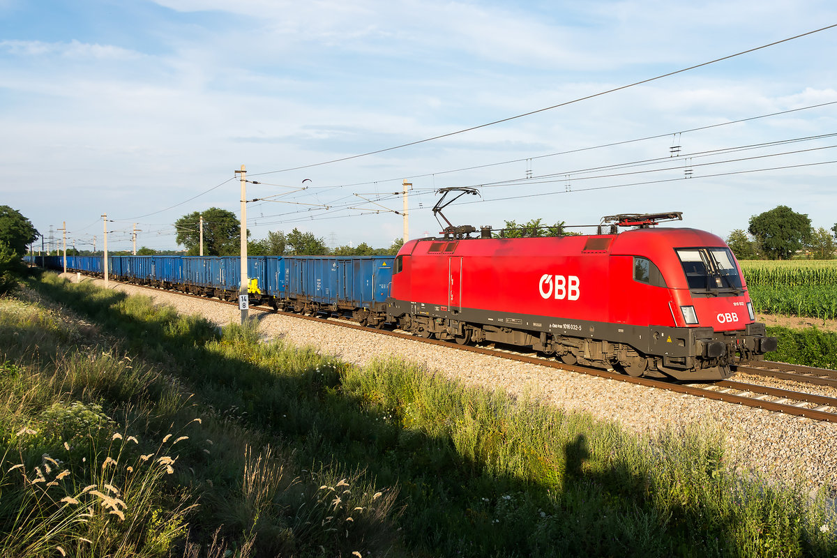 1016 032 ist mit einem Güterzug in der Abendsonne des 20.07.2020, zwischen Deutsch Wagram und Wien Süßenbrunn unterwegs.