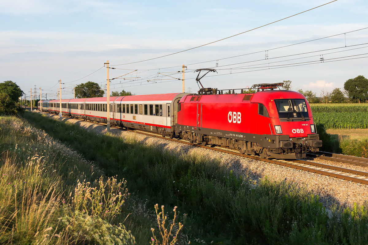 1116 141 brachte am Abend des 20.07.2020 den EC 105 "Porta Moravica" nach Graz. Die Aufnahme entstand vor Wien Süßenbrunn.