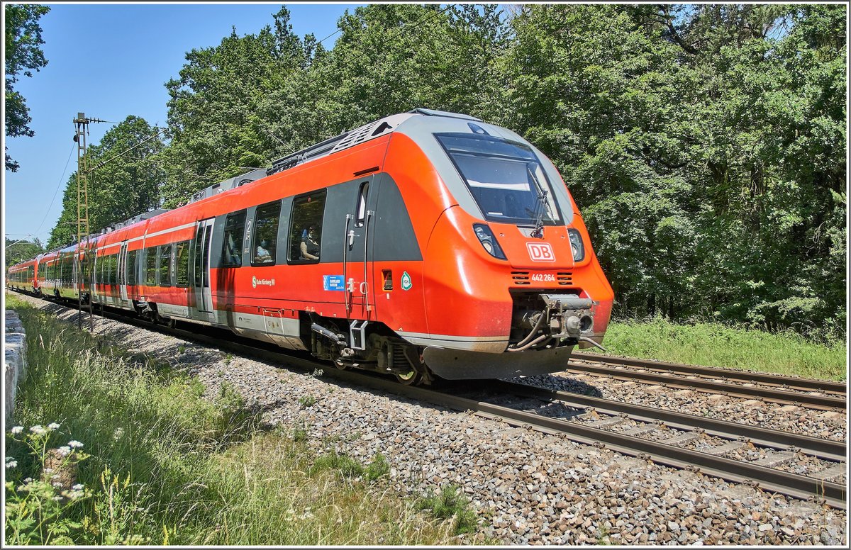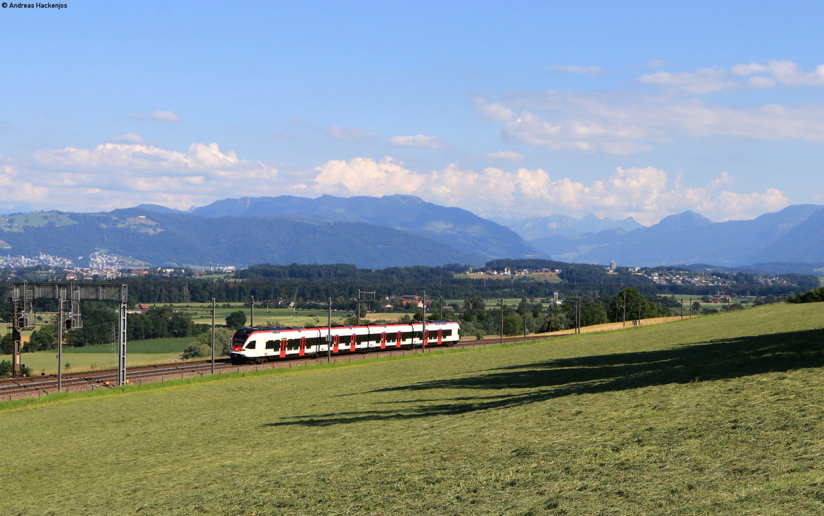 Ein sechsteiliger Flirt 3 von Meridian ist am 20.07.2020 bei Niederaudorf unterwegs nach Kufstein, im Hintergrund links der Zahme Kaiser, rechts der Wilde Kaiser