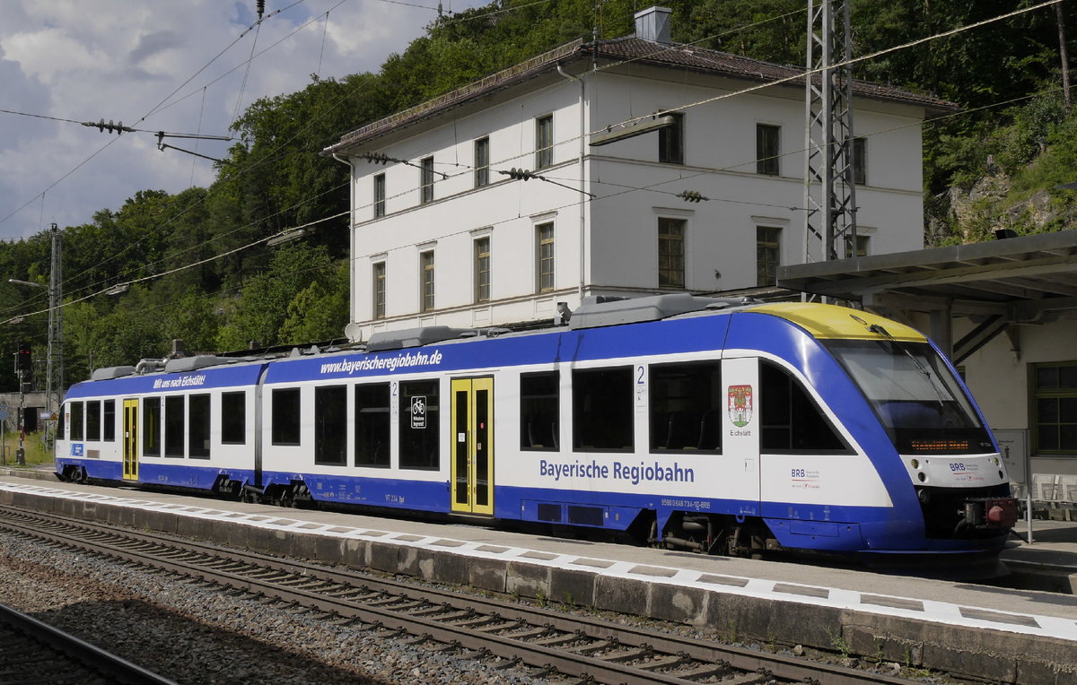 648 234 bediente am 19.7.20, passend zu Wappen und Namensgebung, den Pendel Eichstätt Bf - Eichstätt Stadt. Aufgenommen am Hausbahnsteig (Gleis 1 Nord) von Eichstätt Bf.