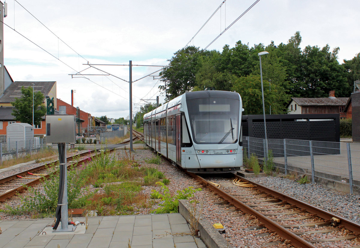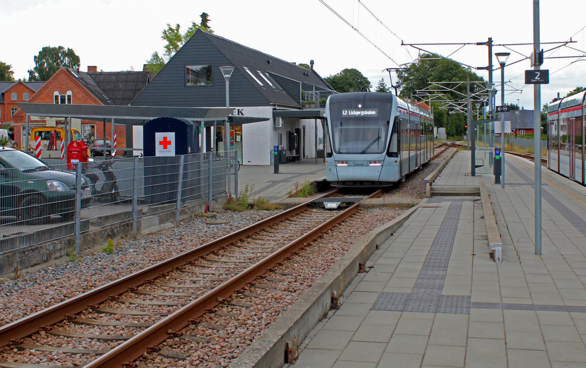 Eine Straßenbahn auf einer - ehemaligen - Eisenbahnstrecke! Der Tw 1110-1210 (Stadler Variobahn) der Aarhus Letbane hält am 10. Juli 2020 als Straßenbahnlinie / RegioTramlinie L2 im Bahnhof Malling auf der Bahnstrecke Århus - Odder, einer Strecke, die bis Dezember 2012 von Dieseltriebzügen, den sogenannten Y-Zügen, der Odderbanen und vom Dezember 2012 bis 26. August 2016 von DSB-Dieseltriebzügen des Typs Desiro bedient wurde. Seit dem 25. August fahren hier die Variobahnen der Aarhus Letbane. - Das Bahnhofsgebäude ist umgebaut und modernisiert worden und fasst jetzt die Apotheke in Malling.