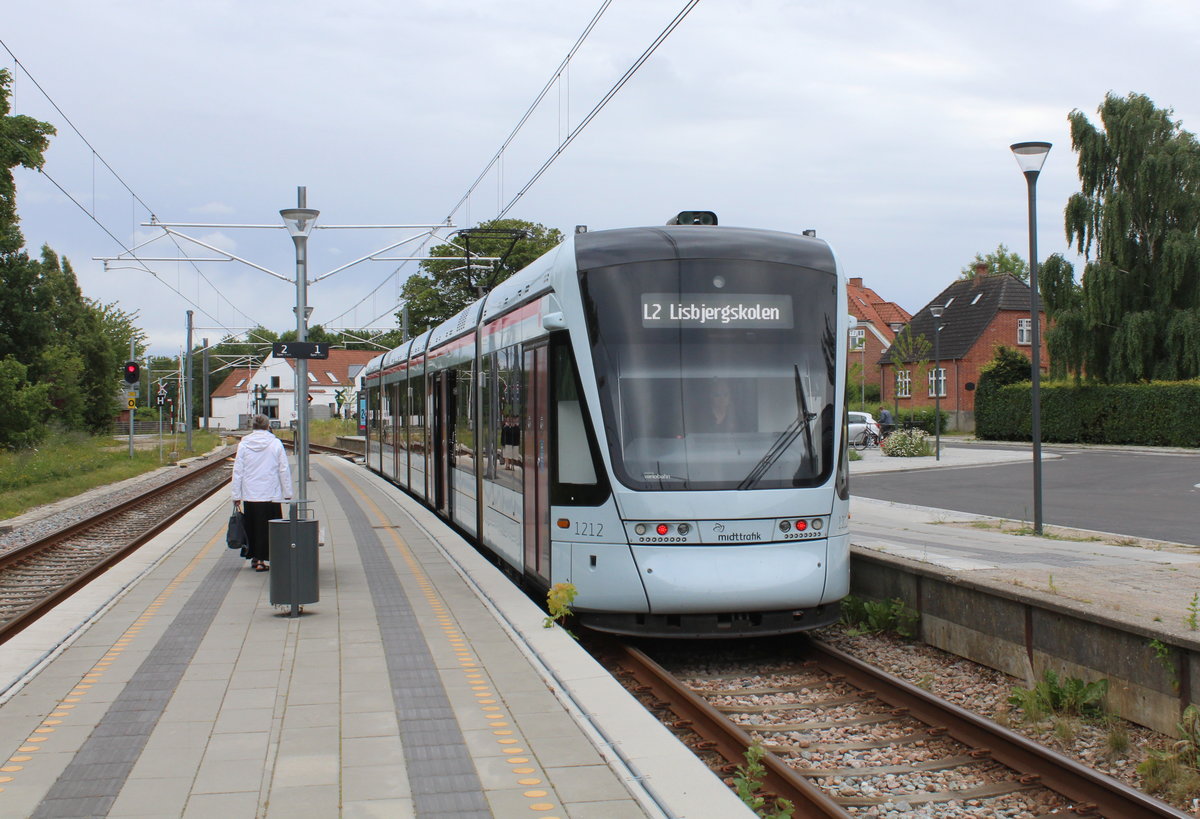 Aarhus Letbane: Ein Zug der Linie L2 (Stadler Variobahn 1112-1212) hält am 10. Juli 2020 im Bahnhof Tranbjerg. Das Ziel des Zuges ist die Schule der Vorstadt Lisbjerg von Århus, Lisbjergskolen. - Seit dem 25. August 2018 bedient die Straßenbahnlinie / RegioTramlinie L2 die ehemalige Privatbahnstrecke Århus - Odder.