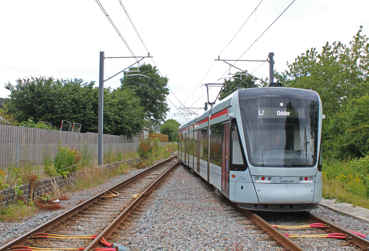 Aarhus Letbane Linie L2: Kommend aus Odder erreicht die Variobahn 1104-1204 die Haltestelle Viby Jylland. Datum: 10. Juli 2020.