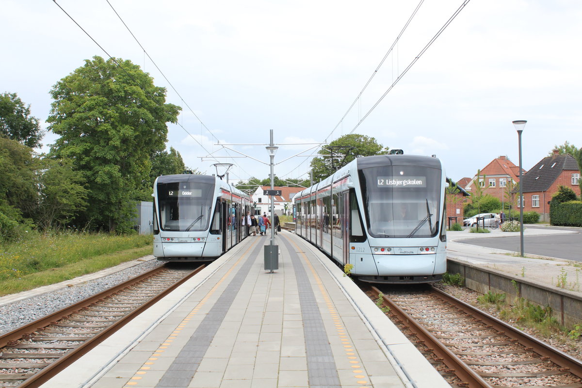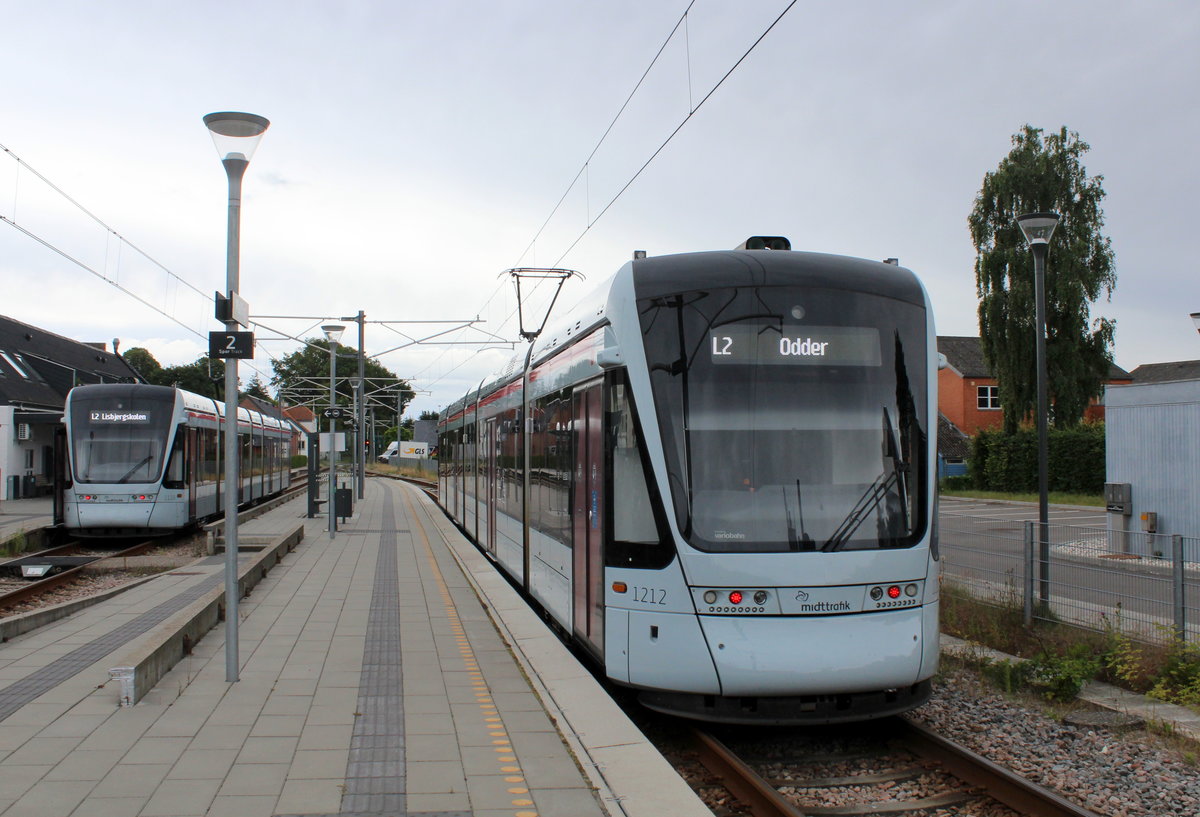 Aarhus Letbane Linie L2: Im Bahnhof Mailling treffen sich am 10. Juli 2020 der Zug in Richtung Lisbjergskolen in Århus (Variobahn 1110-1210) und der Zug nach Odder (Variobahn 1112-1212).
