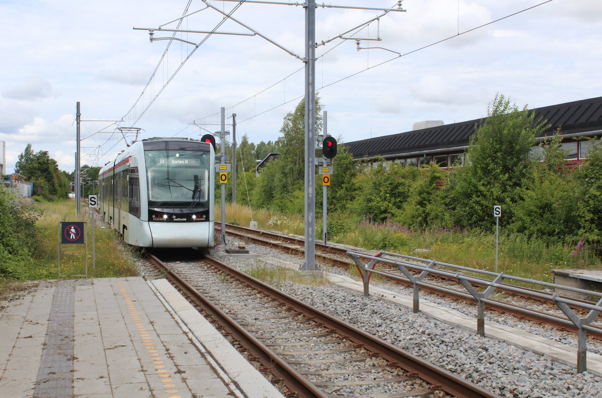 Aarhus Letbane: Der Tw 1104-1204 auf der Linie L2 hält am 10. Juli 2020 im Bahnhof Tranbjerg abfahrbereit.