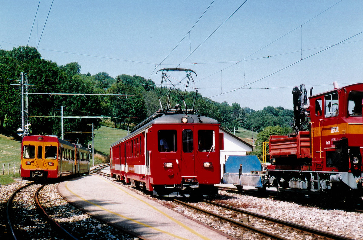 Anlässlich einer Zugskreuzung ist der BDe 4/4 231 mit Bt, ehemals CJ, im Juli 2004 auf der Station Le Muids erlegt worden.