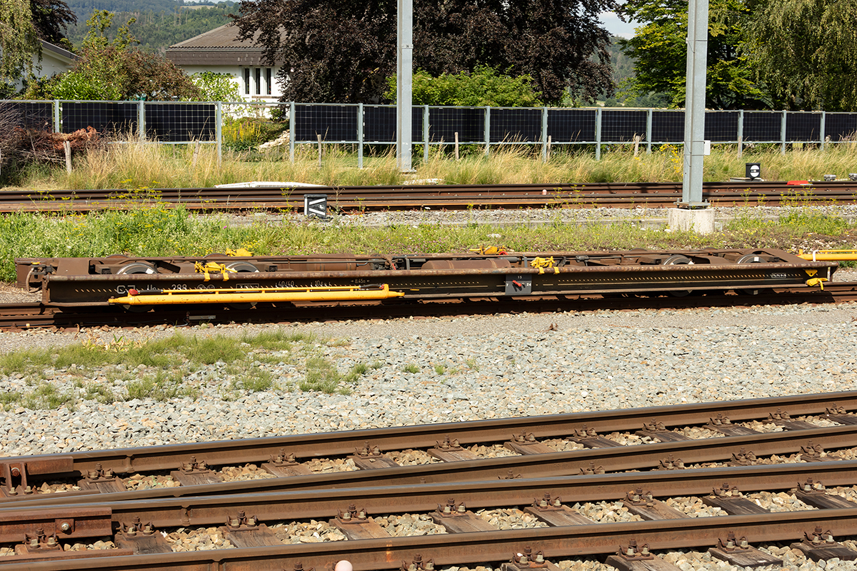 Vossloh Logistics GmbH mit einem ihrer recht neuen Weichentransportwagen Nr. 81 TEN 74 S-LOG 4621 009-5 Sfffgs? am 11.06.20 Bf. Berlin Hohenschönhausen.