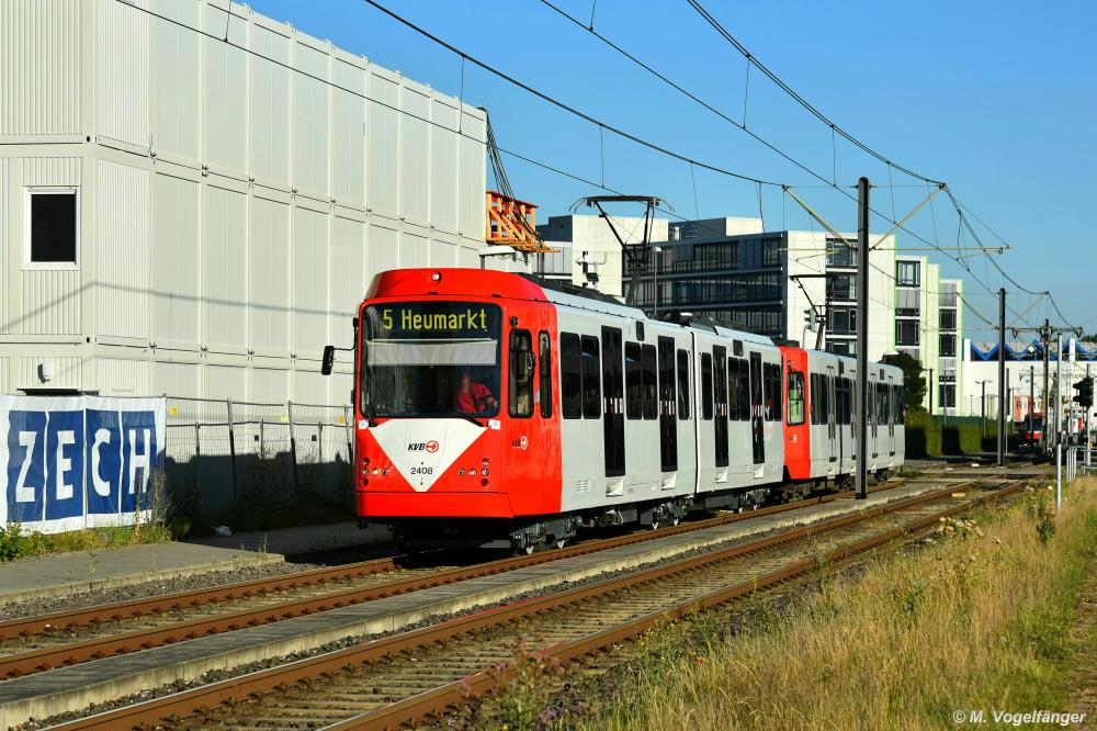 Der 24. sanierte und modernisierte B-Wagen 2408 (ex 2108) befindet sich im Liniendienst. Hier zusammen mit 2302 als Linie 5 Am Butzweilerhof am 23.07.2020.