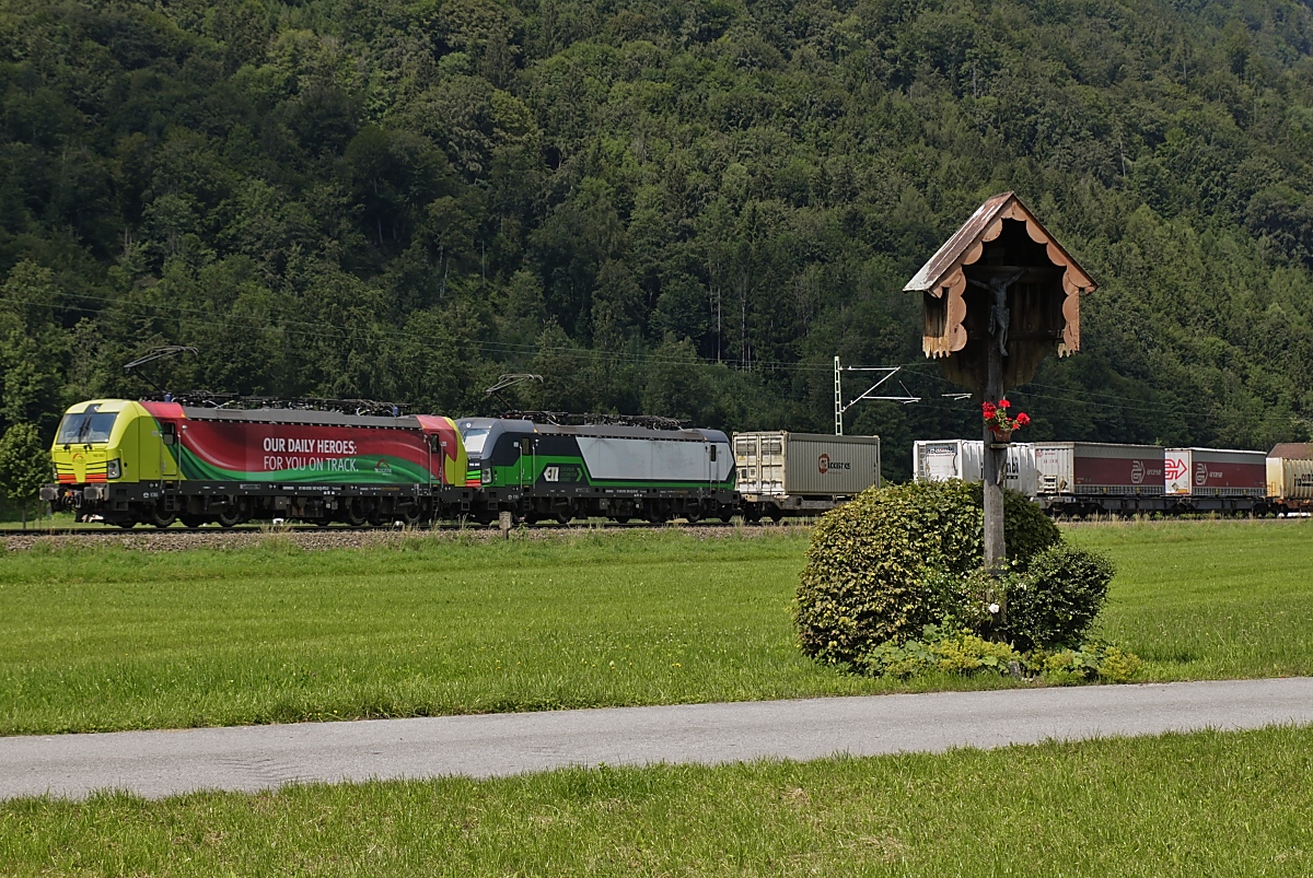 Die beiden Vectrons 193 552 "Our daily heroes" von AlphaTrains und 193 283 von ELL, beide im Einsatz für TXL, am 20.07.2020 bei Niederaudorf. Gruß zurück an den Lokführer!
