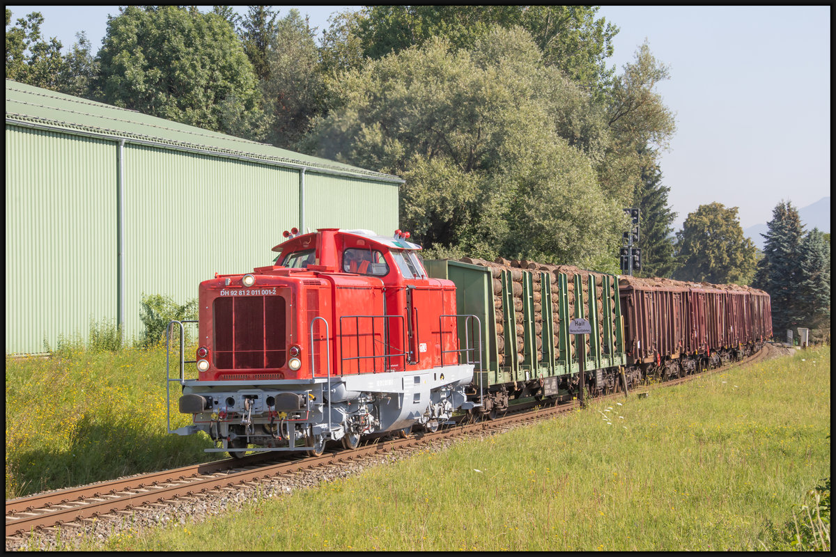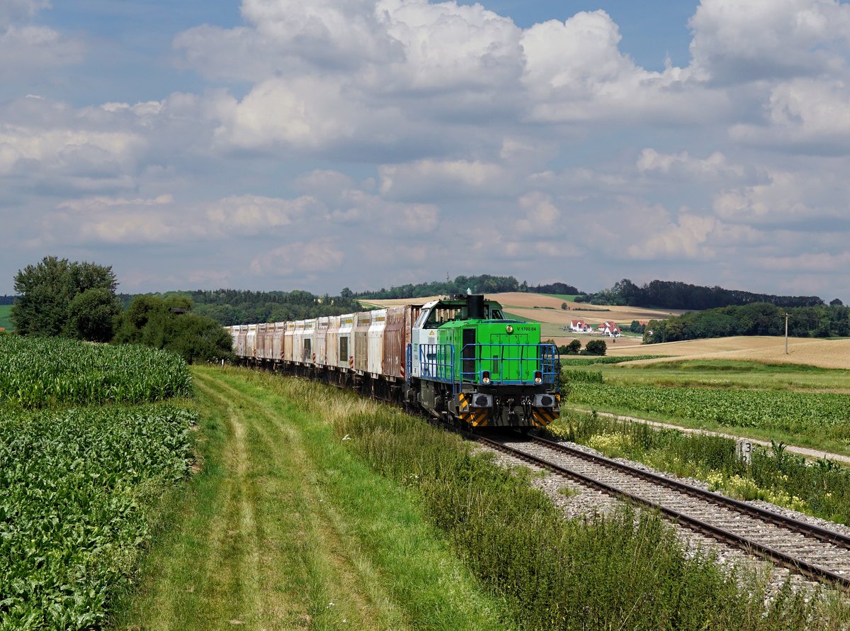 Die V170.04 mit einem Hackschnitzelzug am 19.07.2020 unterwegs bei Fremdingen.