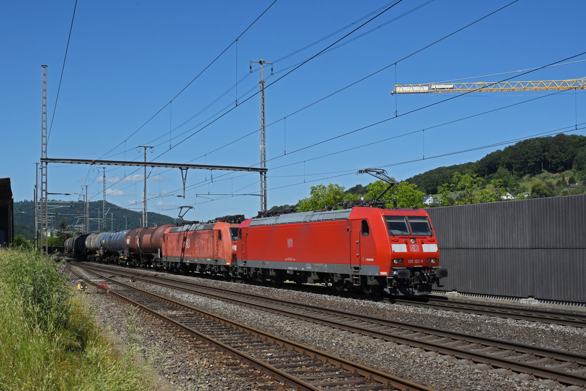 Doppeltraktion, mit den DB Loks 185 122-9 und 185 116-1 durchfährt den Bahnhof Gelterkinden. Die Aufnahme stammt vom 07.07.2020.