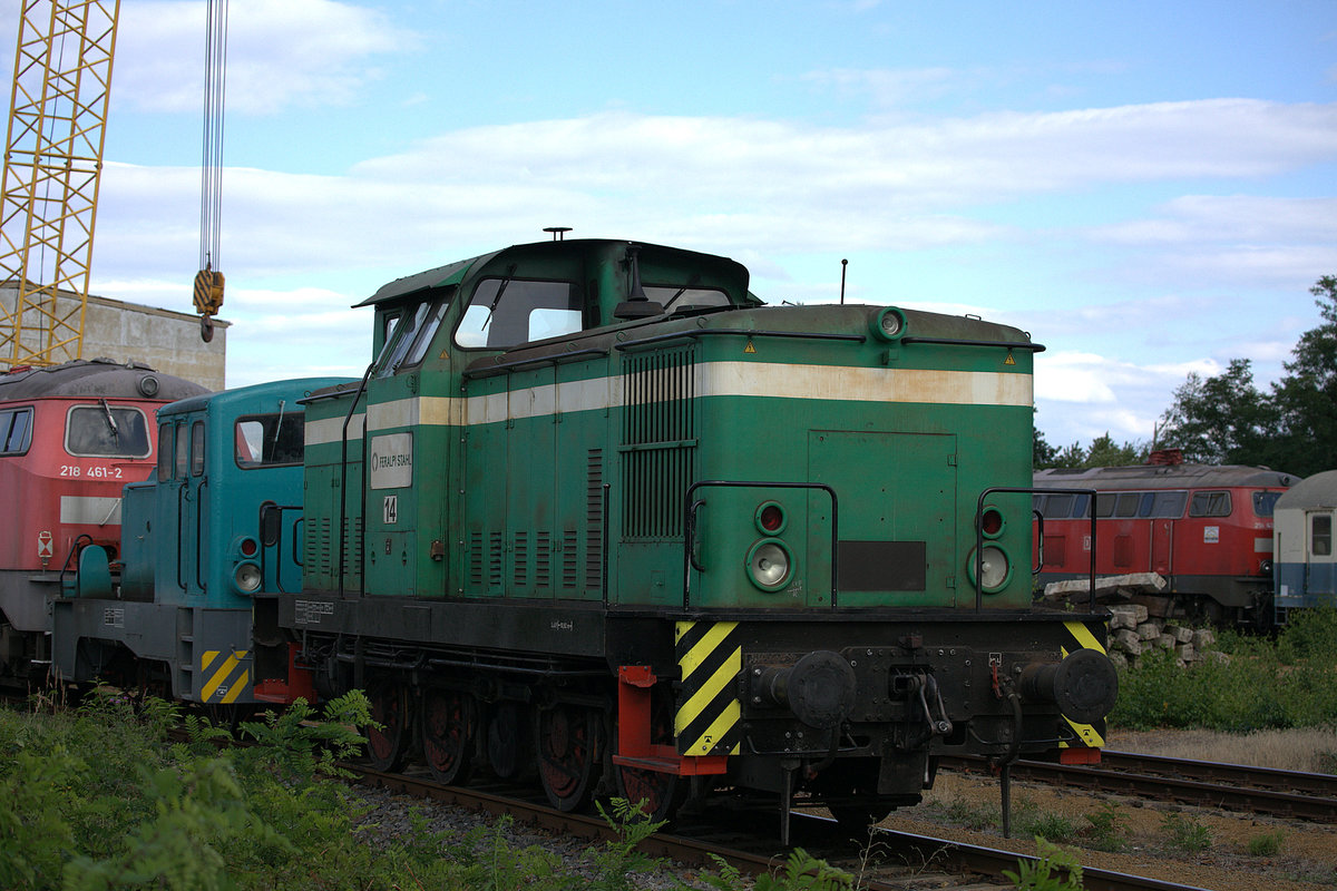 Eine grüne " V60 " führt den Zug auf dem Freigelände der WISAG an, die Lok gehört zum Edelstahlwerk Freital, die Firma WISAG setzt Schienenfahrzeuge instant.