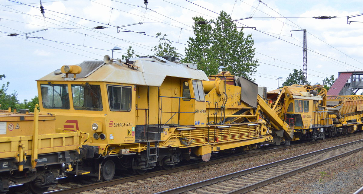 Gleisschotterreinigungsmaschine von P&T Typ RM 80-92 der Fa. EIFFAGE RAIL am Haken von 218 381-2 mit allerlei anderen Wagen am 03.07.20 Bf. Saarmund.