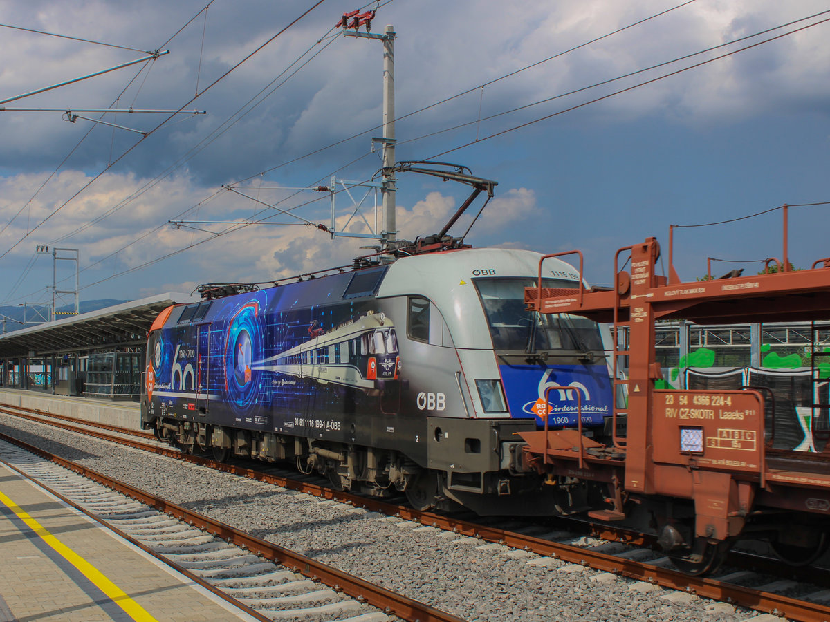 Graz. Die mMn schönste und neuste Werbelok im aktuellen Fuhrpark der ÖBB ist die 1115 199. Am 23.07.2020 konnte das erste Mal die Werbung für 60 Jahre Roco in Graz besichtigt werden. Die Lok zog einen Güterzug von Koper nach Hohenau.