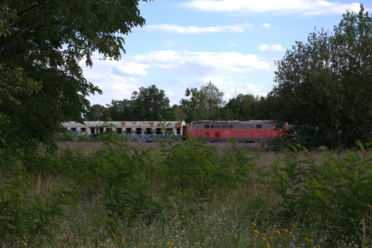 Dahinter eine ausgeschlachtete V100, ein Schnellzuggepäckwagen in der alten ozeanblauenbeigen Lackierung und eine Lok der Baureihe 218.23.07.2020 Brieske 17:16 Uhr.