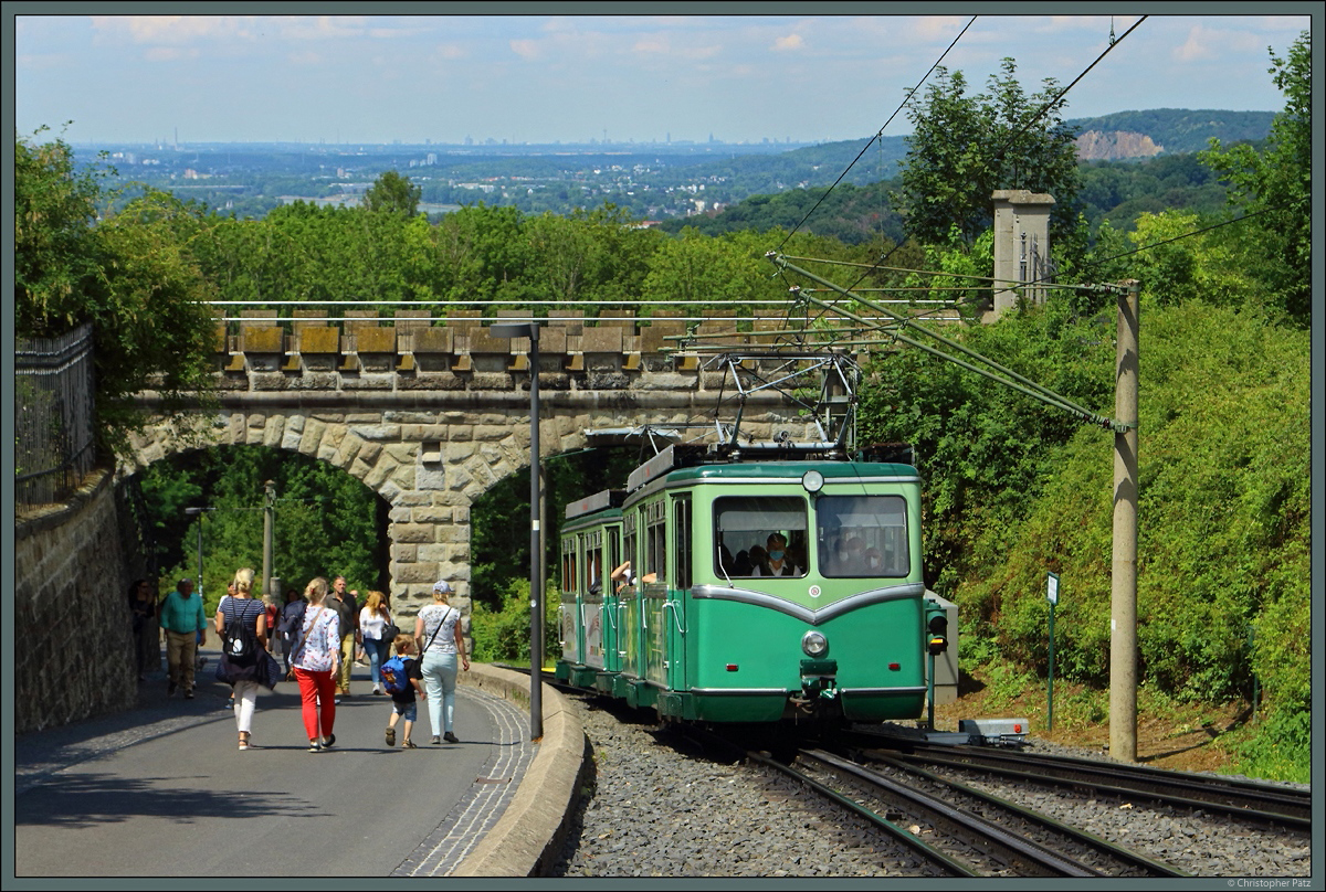 Seit 1883 verbindet die Drachenfelsbahn den gleichnamigen Gipfel mit der Stadt Königswinter. 1953 wurde die Zahnradbahn auf elektrischen Betrieb umgestellt. Die mit der Umstellung beschafften Triebwagen sind auch heute noch im Einsatz. Hier erreicht ein Zug am 11.7.2020 die Mittelstation am Schloss Drachenburg.