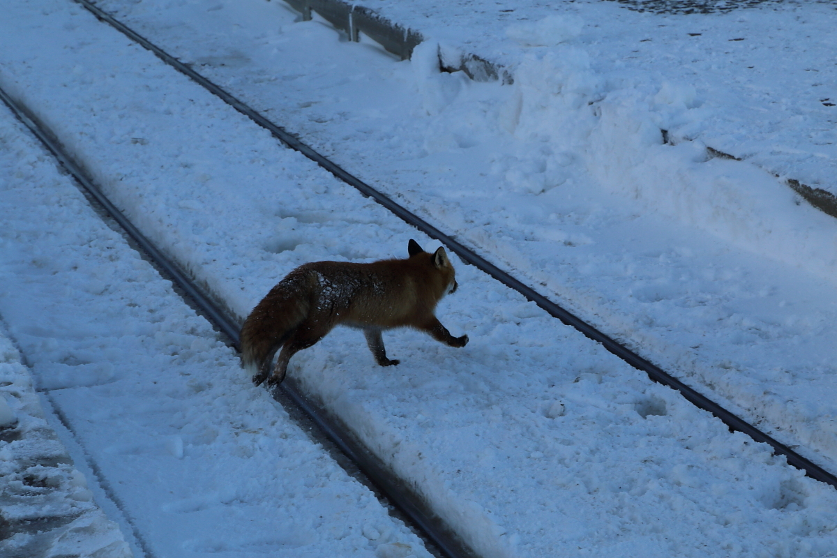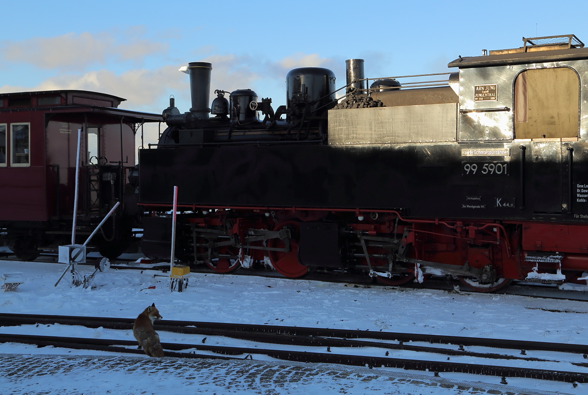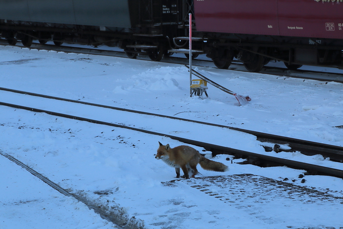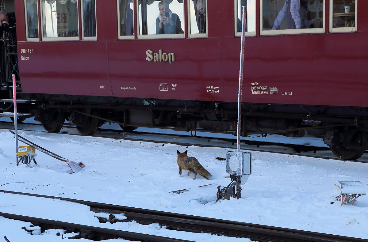 Tierische Begegnung im Brockenbahnhof (Bild 1): Auch ein alter Bekannter gab sich am 24.02.2017 an unserem IG HSB-Sonderzug im Brockenbahnhof ein Stelldichein. In Erwartung eines üblichen Leckerchens spaziert Meister Reineke zur vermeintlichen Futterquelle.