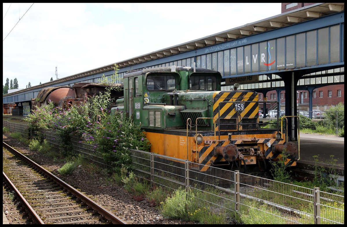 Wer auch immer dafür zuständig sein mag, er sollte sich dringend mal um diesen Museumszug im HBF Oberhausen kümmern. EH 159 steht dort auf einem so bezeichneten Museumsgleis gekoppelt mit einem Schlacke- und einem Roheisenwagen. Und das Ensemble wuchert langsam zu. Zudem frisst der Rost die Wagen langsam auf. Als ich am 20.7.2020 das Foto aktuell machte, konnte ich keine Zukunft für den einstmals interessanten Zug erkennen. Schade drum!