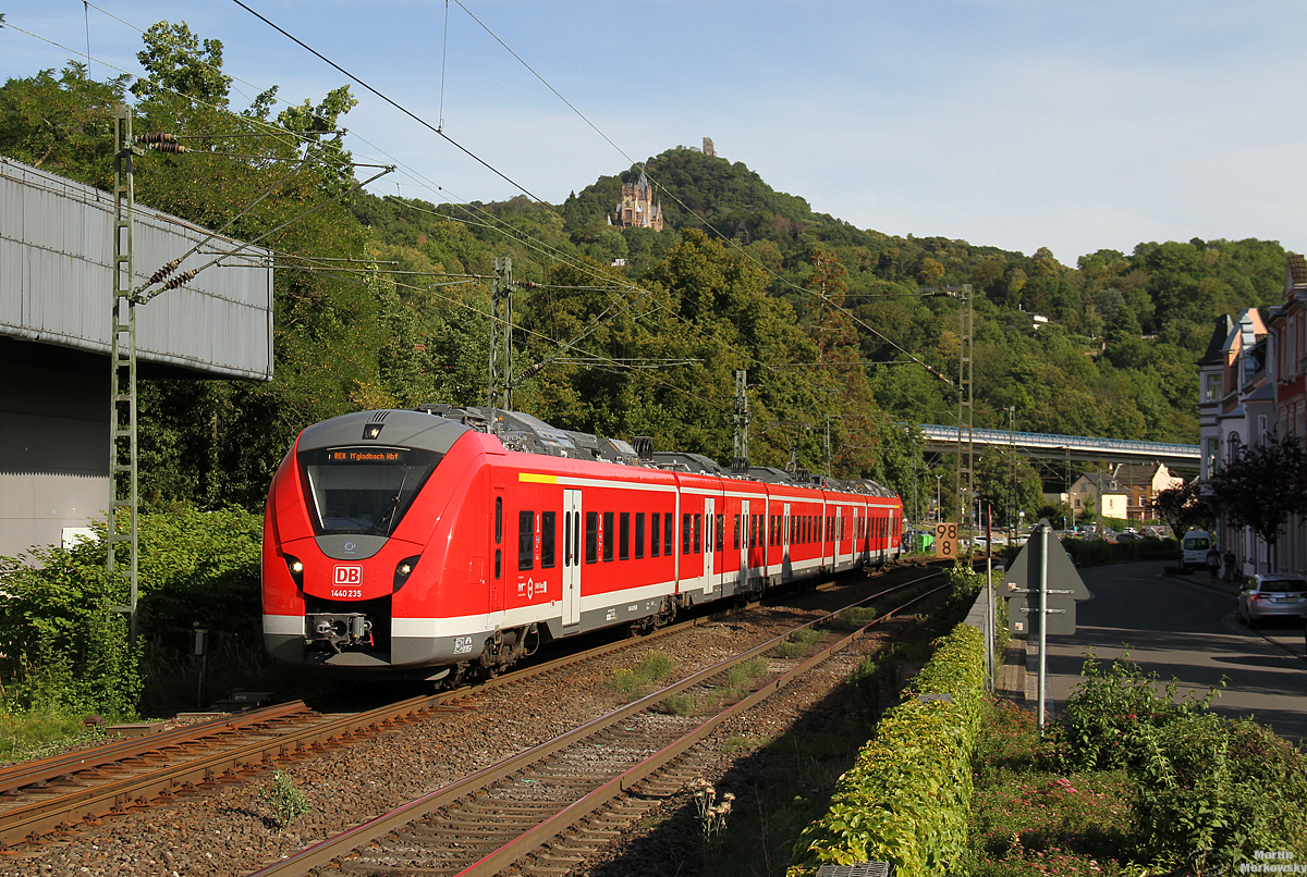 Der Triebwagen 1440 230/730 auf dem RE 8 (Mönchengladbach - Köln - Koblenz) beim Halt in Niederdollendorf in Richtung Koblenz.