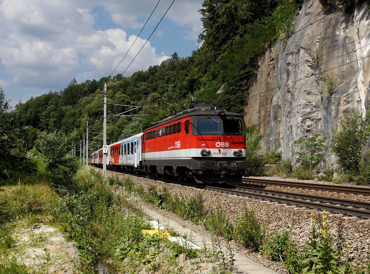 Die 1142 647 mit einem REX nach Linz am 25.07.2020 unterwegs bei Wernstein.