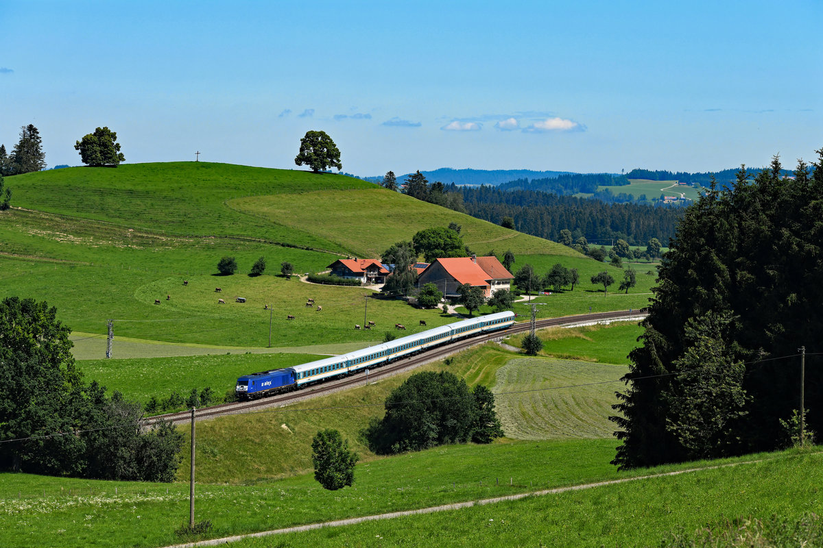 Mit sechs Wagen und nur einer Lok wies der EC 195 genau die richtige Länge für das Motiv mit Blick auf die kleine Ortschaft Zell auf. In flotter Fahrt nähert sich die 218 430 Oberstaufen und überholt dabei einen Traktor, der mit der Heuwende beschäftigt ist (25. Juni 2020).