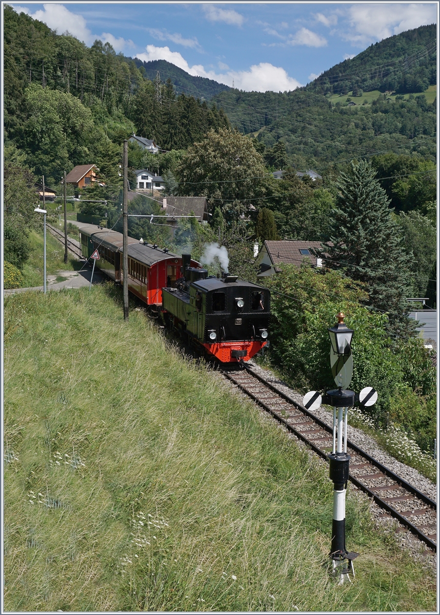 Die Blonay-Chamby Bahn G 2x 2/2 105 fährt mit ihrem Dampfzug zurück nach Chaulin und konnte unter einem schattigen Baum stehend, von mir in Blonay fotografiert werden.