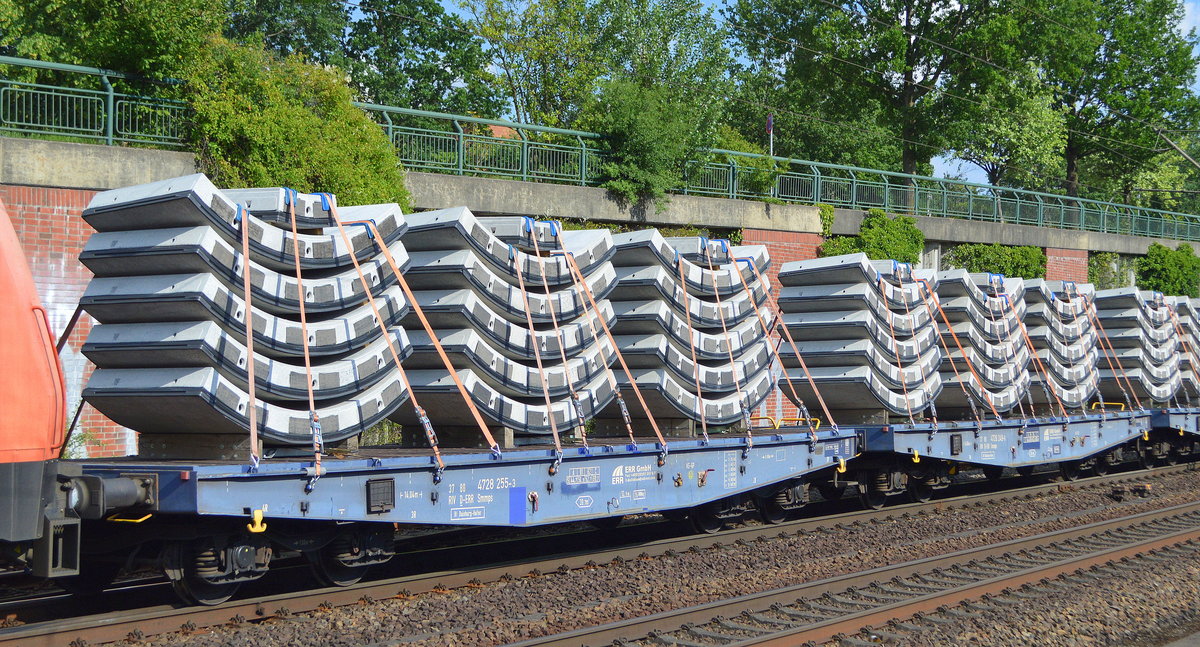 Drehgestell-Flachwagen mit Niederbindegurten und Betonfertigteilen für den Tunnelbau beladen vom Einsteller ERR GmbH, der vordere Wagen trägt die Nummer 37 RIV 80 D-ERR 4728 255-3 Smmps Bf. Duisburg-Hafen in einem Ganzzug am 25.06.20 Hamburg-Harburg.