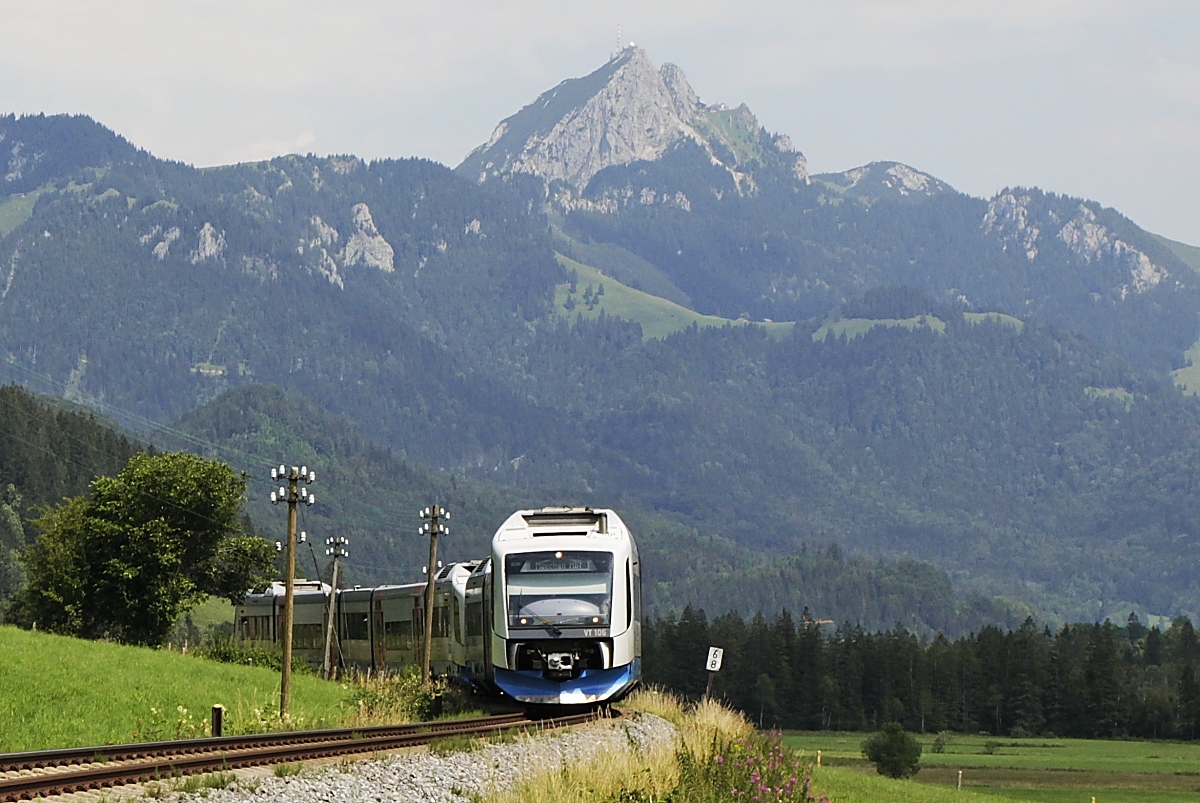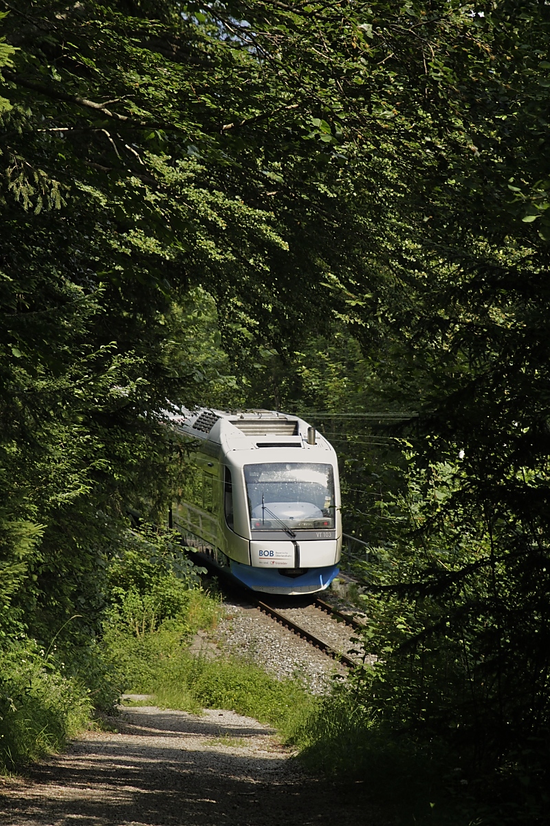Kurz nach Verlassen des Bahnhofes Schliersee wurde VT 105 am 16.07.2020 auf der Fahrt nach Bayrischzell aufgenommen