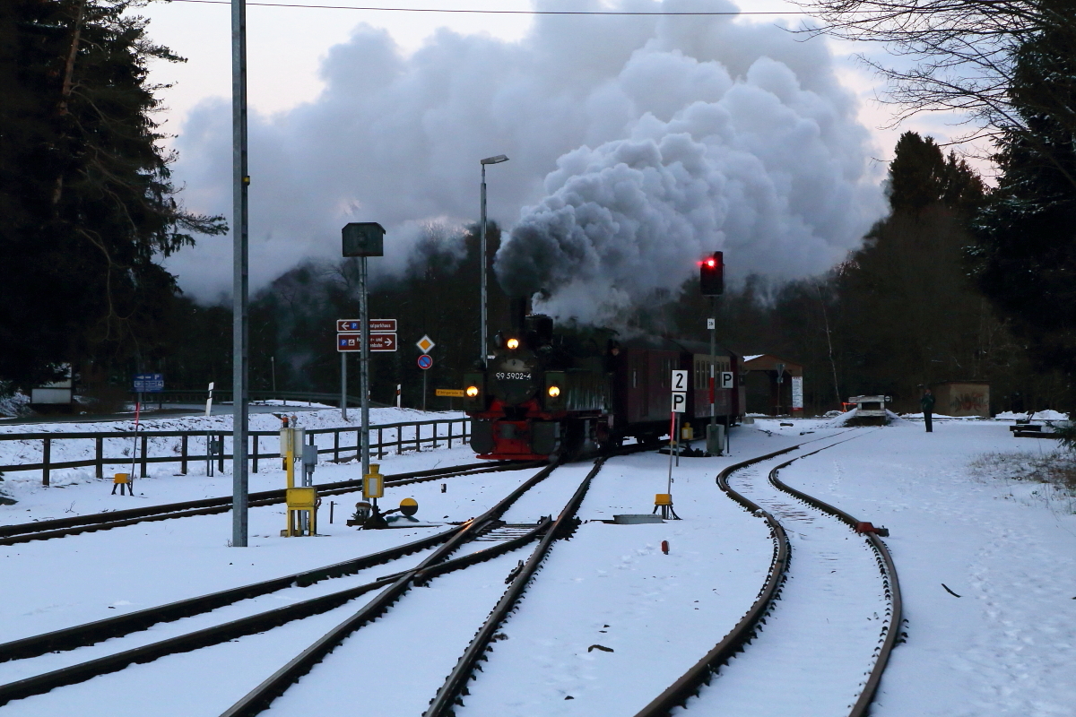 Einfahrt von 99 5902 mit unbekanntem Sonderzug am Abend des 24.02.2017 in den Bahnhof Drei Annen Hohne. Nachdem der Zug eingelaufen ist, wird unser IG HSB-Sonderzug seine Fahrt nach Wernigerode fortsetzen. (Bild 1)