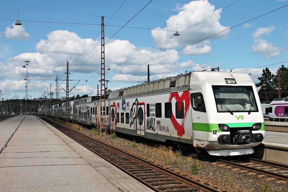 Einfahrt am Mittag des 12.07.2019 von Sm4 6415/6315 "Mall of Tripla" zusammen mit Sm4 6427/6327, Sm4 6429/6329 und Sm4 6404/6304 als Regionalzug auf Gleis 8 in den Hauptbahnhof von Helsinki. Später ging es als Regionalzug zurück nach Riihimäki.