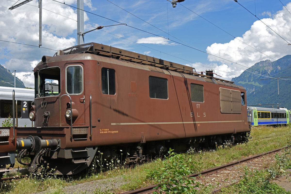 Für die Re 425 177 der BLS hat bald die letzte Stunde geschlagen. Hier steht die ausgeschlachtete Lok auf einem Abstellgleis beim Bahnhof Interlaken Ost. Die Aufnahme stammt vom 26.07.2020.