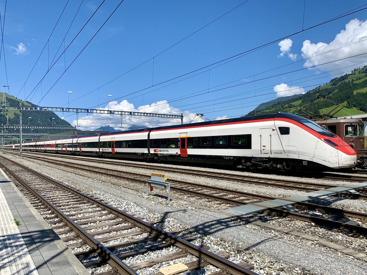 Giruno RABe 501 012 am 25.7.20 beim Bahnhof Frutigen abgestellt.