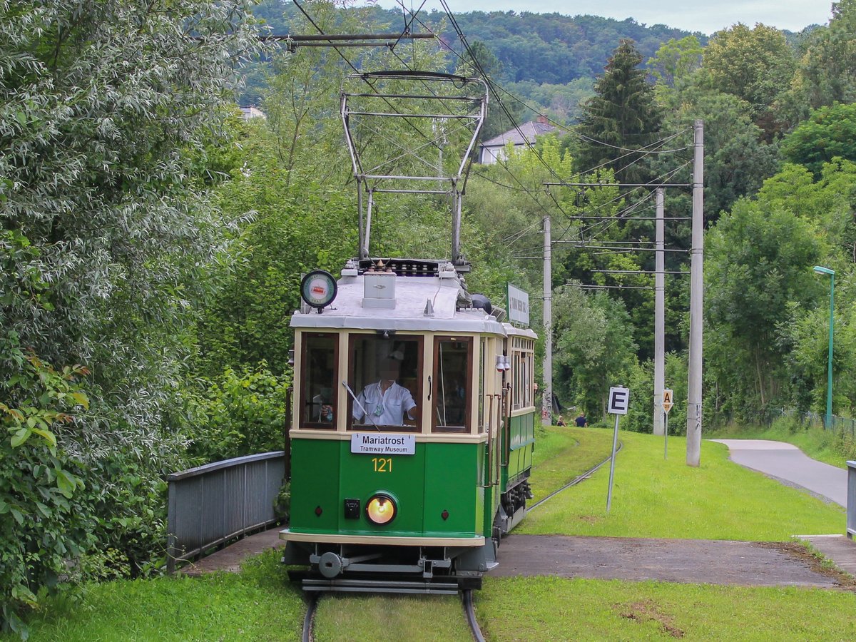 Graz. Am 26.06.2020 öffnete das Tramway Museum Graz das erste Mal seine Pforten für Besucher. TW 121+60B waren als Shuttle vom Jakominiplatz nach Mariatrost zum Öffnungstag im Museum unterwegs, hier bei Rettenbach.