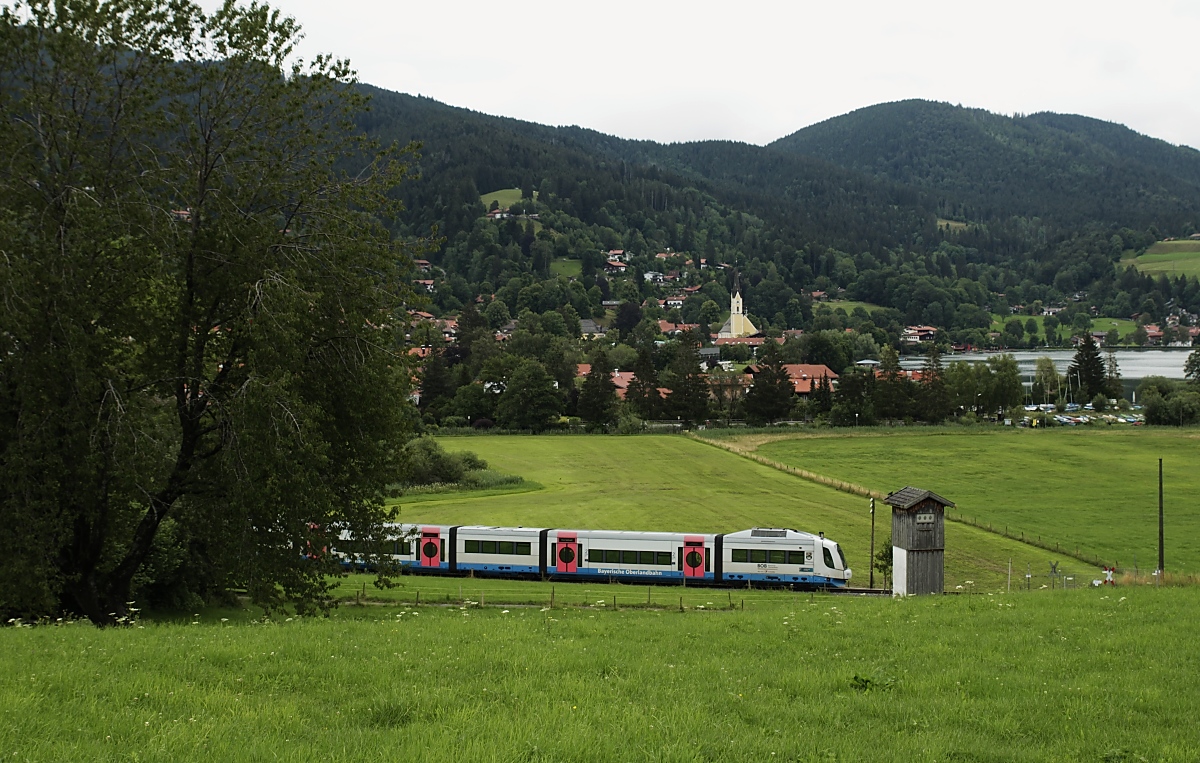 Am 16.07.2020 fährt der VT 117 in Schliersee ein, dahinter die zwischen 1734 und 1737 errichtete Kirche St. Martin